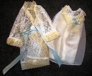 Vintage Barbie The Dream Team White Lace Robe With Blue Ribbon Tie Waist The nightgown is sheer white nylon lined in tricot. It has lace trimmed yoke accented with a blue ribbon. The robe is white lace with lace trim and a blue ribbon sash. THe slippers are white felt with blue ribbon under lace. |