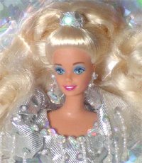 She is wearing a glamorous silver lame gown with a full skirt and dropped waist. The skirt has an overskirt consisting of many layers of sparkling tulle. Strands of silver beads drop from the silver lame bodice. She has silver earrings and a silver jewel hair ornament holds back her long blonde hair.