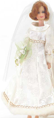 Vintage Barbie Bridal Brocade White Brocade Gown with White Fur Trim The brocade dress has a gored A-line skirt and an empire waist. It has long sleeves and a roll collar. The empire waist, sleeves and hem are trimmed with white and gold braid. The hem of the dress and sleeves are also trimmed in white faux fur. The veil is made of a brocade cap, trimmed in the same white and gold braid. It has two layers of tulle. |