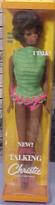 Talking Christie Doll was introduced in 1968. She was the first African American Barbie size Doll. Black Francie, introduced in 1967, was the very first in the Barbie family of dolls. Julia doll, using Christie's head/face mold, was introduced in 1969. While Christie did not have any of her "own" clothes, other than the doll's original outfits, she had a Barbie size body and could share Barbie's magnificent wardrobe.