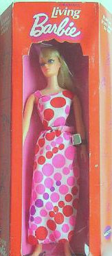 Doll Name: Living Barbie Model #: 1116 - Same model number as Dramatic New Living Barbie - they shortened the name on this version! Box Date: 1970 Hair Colors: Blonde, Brunette, Red Face: TNT Head. Blue centered eyes, Rooted eyelashes, Deep pink lips and blush. Clothing: White bodysuit with pink and red bubble print with matching long wrap skirt.