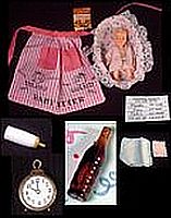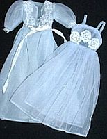 1965 This was a unique set released in 1965. Not only was there an outfit for Barbie (see picture on right), Midge had an outfit as well. Included in this set were as many accessories as needed to have a dinner party from a toaster to a tea kettle. There were three pieces not sold in any other set...candelabras, a silver serving tray, and a blue bowl of flowers. |