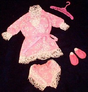 Vintage Barbie Dream Wrap Pink Cotton Robe with White Lace Trim and Ribbon Tie The shorty pajama top is made like a robe and has a pink ribbon tie. The top and matching panty are trimmed in white lace. The slippers are hot pink felt with flowers. |