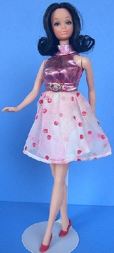 Vintage Barbie Glo-Go Halter Dress with Raspberry Metallic Knit Lame Top and Belt The halter top bodice has a high collar and back closure. The bodice on this dress is very prone to fade out - leaving a silver or lighter color. In this picture it is faded, it should be a darker raspberry color. I have this dress from my childhood collection & I successfully "restored" the bodice by using metallic acrylic paint. It looks beautifully mint now! This dress can be harder to find and besides the problems with the bodice, the chiffon overskirt tend to show dirt and wear & tear easily. |