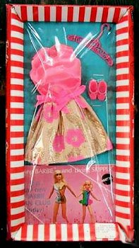 Vintage Barbie Glowin' Out Sleeveless Dress with Pink Satin Bodice and Brocade Skirt This mod dressy dress is very popular collectors and can be hard to find, especially in great to mint condition. The dress has a pink satin sleeveless bodice and a full short skirt. The skirt is a gold lame brocade fabric with. There are two pink satin bows at the waist. |