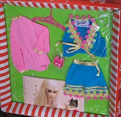 The pink blouse is a tricot body blouse (remember those?) with gold braid at the neck and cuffs. The mini skirt and matching vest are made of turquoise blue velveteen. They are both trimmed with a loop braid in hot pink and chartreuse and gold braid. The vest has a gold braid tie closure. This ensemble came with either Aqua Blue pilgrim shoes, Hot Pink Pilgrim shoes or Hot Pink Bow shoes.