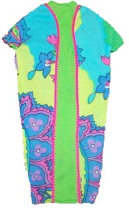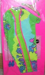 Vintage Barbie In Blooms Lime Green, Fuchsia and Aqua Blue Print Nylon Caftan I think this is the closest Barbie ever came to a Moo-Moo! The bright, mod colored caftan is done in a paisley print. There is a wide green front panel with hot pink trim. It is a slip over style with a V-neck. This is fairly easy to find and they are usually in great condition - it is hard to destroy nylon! |