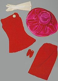 This fabulous ensemble is a perfect snapshot of the elegance and grace of the 1960s. It is very popular with collectors and is very hard to find. When it is found, it can be very expensive. The pin is often missing from the tunic. This is one of my favorite ensembles from the mid-60s. I just love it on an American Girl Barbie - they are absolutely perfect together. |