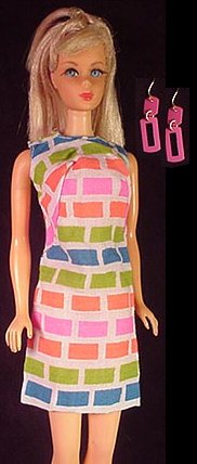 Vintage Barbie Print Aplenty Multi-Color Block Print Dress This is another one of Barbie's sleeveless mod print dresses from the late 1960's. The dress and shoes are fairly easy to find. The earrings can be very hard to find - although reproductions of them are usually available for sale on eBay. Like the others, this dress has the mod colors and bold geometric prints that were so popular in the late 60s, along with the simple lines and shorter length. |