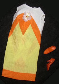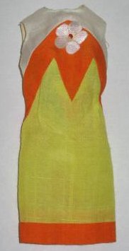 Vintage Barbie Tropicana Orange, Yellow & White Sheath Dress with Daisy This is one of several bright colored sleeveless dresses from the late 1960s. This one can be hard to find, especially with the daisy intact and in good condition. |