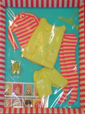 Vintage Barbie Tunic 'n Tights Pink and Yellow Striped Turtleneck and Tights This is one of the hardest ensemble from 1968 to find. The long sleeve turtleneck and tights are bright yellow and hot pink stripes. They are topped by a bright yellow shiny vinyl tunic and shorts. The tunic has a scoop neck and patch pockets. Both of the vinyl pieces are stitched in hot pink. I think one of the reasons it is hard to find is that the vinyl does not hold us as well through the years as the fabric pieces. |