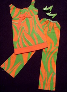 Vintage Barbie Two-Way Tiger Lime Green and Orange Swirl Patterned Sleeveless Tunic with Orange Bow And Trim The orange and green cotton tiger print top can be worn as a mini dress or a tunic top with the bell bottom pants. |
