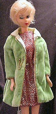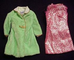 Vintage Barbie Velvet Venture Coat with Gold Trim ![]() The green velvet coat has a double chain decoration at the waist. The lame dress is sleeveless. |