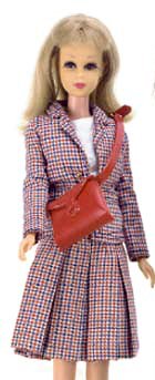 Vintage Francie Checkmates Red, White and Navy Hounds-tooth Plaid Jacket with Self Belt and Gold Buckle Francie's checked suit can be hard to find. The red purse can especially be a challenge to obtain. Because it was only made for one year, it is not readily available. When it is found, it is usually in good condition. The fabric holds up well and is not particularly prone to any problems. |