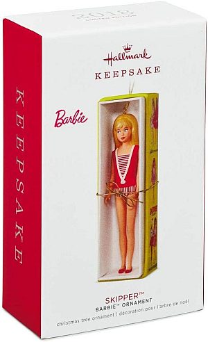In 2018, a Limited Edition Barbie Hallmark Keepsake ornament featuring Skipper was issued. This ornament captures the moment in time when Barbie's little sister was first introduced. Skipper is wearing the same one-piece red and white swimsuit originally issued in 1964.