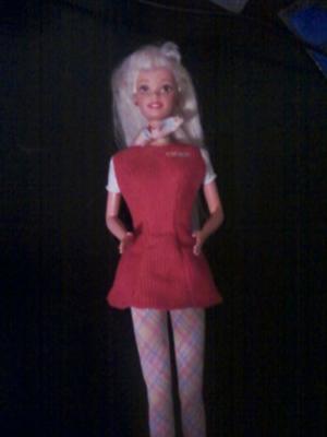 She has these very distinct bangs and dirty brown hair with round circular diamond like earrings. This is not her original outfit, just a favorite of mine from Sparkle Barbie from the 1990's and I have a gold tie in her hair.
