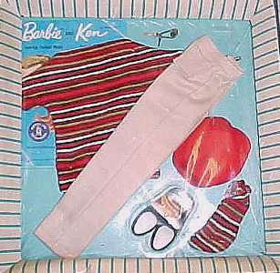 In the 1961 Mattel dealer catalog, this ensemble was pictured with a yellow knit shirt with an open neck with red trim. (It looks similar to the style of the white knit shirt from Time for Tennis #790 (1962 - 1963) and Fraternity Meeting #1408 (1964) to me.) It was also shown like this in a Barbie TV ad - but to my knowledge, one of these has never been found.